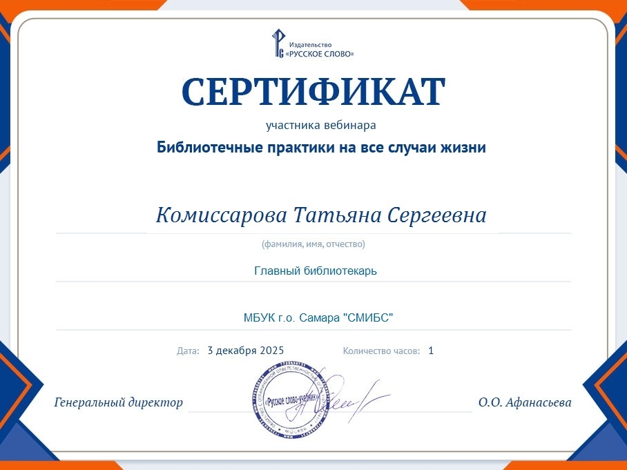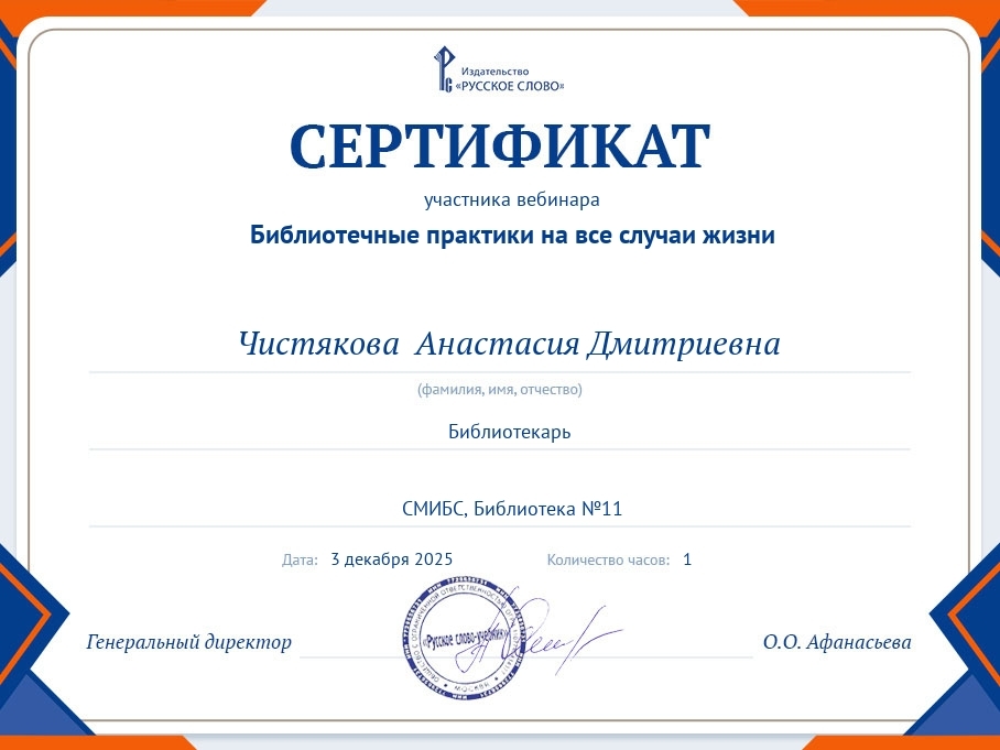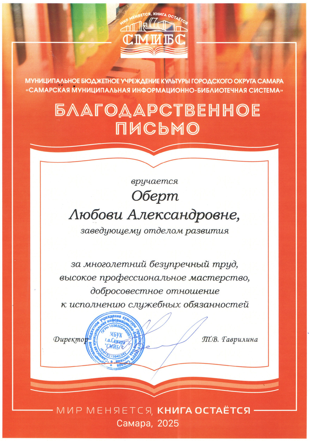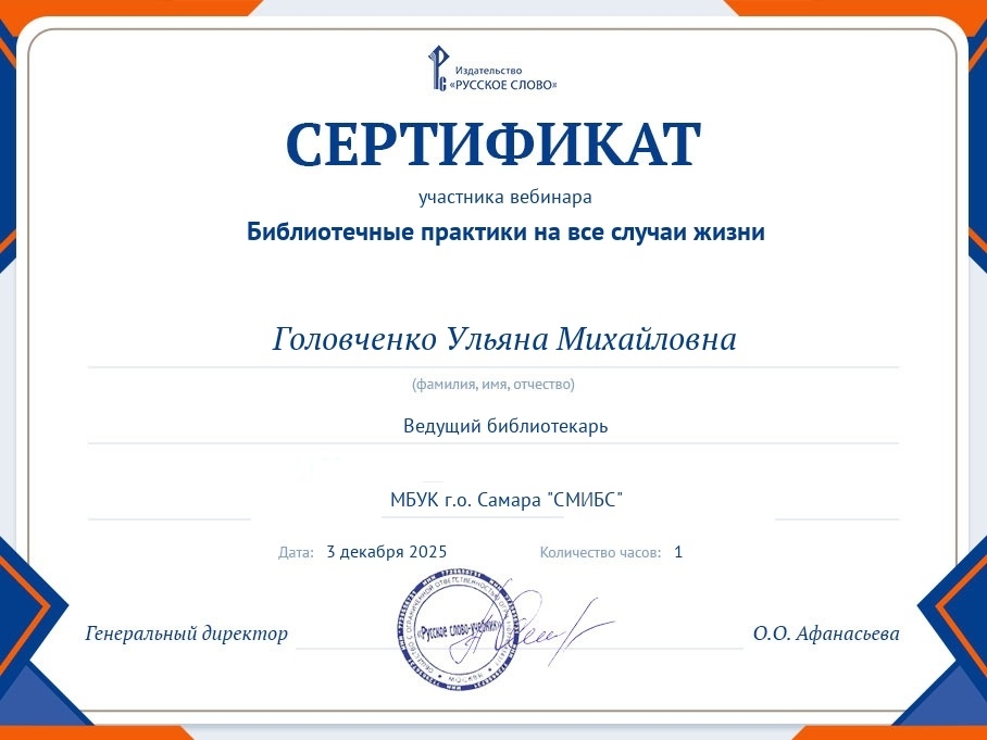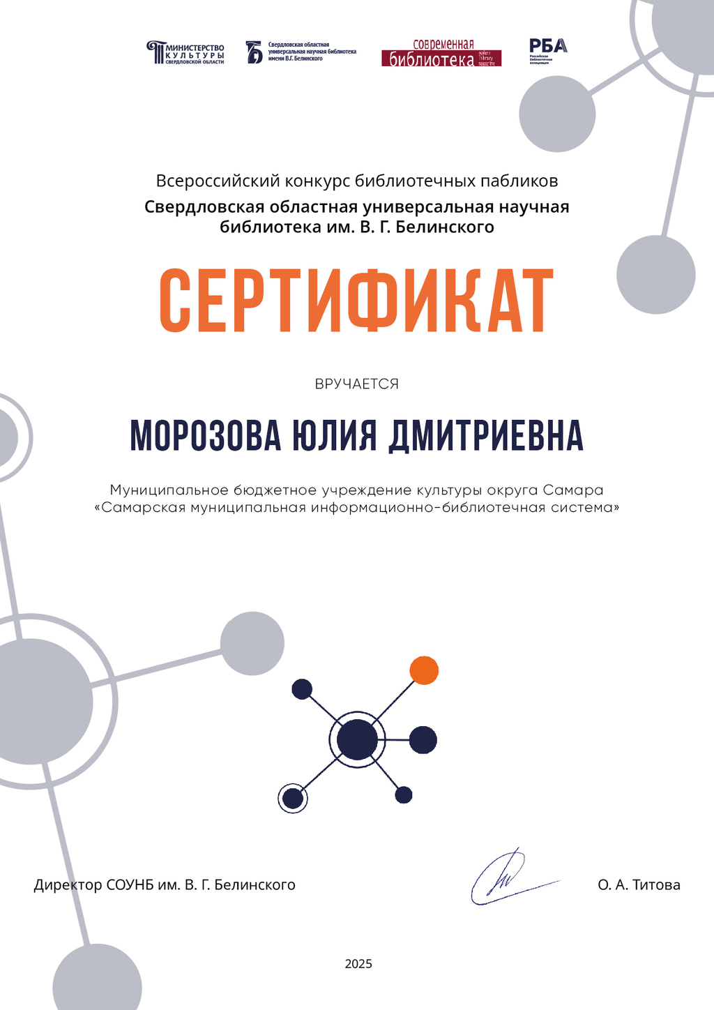 Чиндина М.С., ЦГБ ЦГБ Тишина Е.А., ЦГБ Коноплева Т.А., ЦГБ ф1 Воробьёва Е. Л. Диплом ф1 Батова Н. Г. Диплом Барсукова_ф33_Диплом_участника Перепелкина Е.В., ЦГБ Ф.12 Диплом (Лермонтов) ф.12 Диплом VIII Всероссийская акция 200 минут чтения Сталинграду посвящается Бомбина Е.В. Библиотека №29 Почетная грамота Оберт Л.А., отдел развития Почетная грамота Данилова О.В., ф.7 грамота Белова Л.Н. ф.11 Грамота Тихонова И.Ю. ф.11 Грамота благодарность Роману Сукманову благодарность библиотеке 16 благодарность Гузановой Е.А., ф.16 благодарность Кузнецовой С.В., ф.16 ф.31 коллективу филиала от Администрации района Ф.28 Стрижакова Благодарность Администрации Красноглинского района Т.И. Ф.28 Стрижакова Т.И. Благодарность ТОС Управленческий Библиотека №29 Благодарность Немчанова ф.2 Воробьёва ф.1 Левина ф.2 Ф.22 Морозова, отдел развития Суворов А.С., отдел развития Ф.28 Благодарственное письмо Департамент 80 лет Библиотеке 28 Костина О.С. ф19 Благодарственное письмо ф.6 Благодарственное письмо ф.5 Евтюхина С.И., Библиотека №29 Благодарственное письмо Бомбина Е.В. Библиотека №29 Благодарственное письмо Черных Л.Н. Библиотека №29 Благодарственное письмо Князевой Г.Ю. Библиотека №29 Благодарственное письмо Библиотека №29 Благодарственное письмо Горбунова Е. В., ф.5 Благодарственное письмо Конференция Ваулина Л.Б., ф.8 Ф.12 Валеева А.Г. Благодарственное письмо Черных Л.Н. Библиотека №29 Благодарственное письмо Данилова О.В., ф.7 Благодарственное письмо ф.11-БП Тихонова И.Ю. ф.11 БП ф.11 БП Бомбина Е.В. Библиотека №29 Благодарственное письмо Черных Л.Н. Библиотека №29 Благодарственное письмо Костина О.С., ф19 Благодарственное письмо Оберт Л.А., отдел развития ф.11-1 Горбунова Е.В., ф.5 Горбунова Е.В., ф.5 Библиотека № 5 Носач О.В., ф.5 Руденко О.Н., ф.5 Библиотека № 5 Горбунова Е.В., ф.5 Арсланова О.В., ф.5 Преодоление Носач О.В., ф.5 Горбунова Е.В., ф.5 ф.11-2 Ф.12 Матерова (Шукшин) Ф12 Сертификат волонтеры 2025 Тимофеева Ю.К. Морозова Ю.Д. Оберт Л.А. Оберт Л.А., отдел развития Оберт Л.А., отдел развития Оберт Л.А. Ф.28 СтрижаковаТ.И. Диплом Засекинские чтения Носач О.В., ф.5 Ф.12 Сертификат участника Тишина Е.А., ЦГБ Краснянская И.Ю., ф.5 Сертификат участника Память в наследство Носач О.В., ф.5 сертификат Головченко У. Сертификат Комиссаровой Т. Сертификат Тихоновой И.Ю. Сертификат Чистяковой А. Перепелкина Е.В., ЦГБ Оберт Л.А., ОР Носач О.В., ф.5 Сертификат Носач О.В., ф.5 Носач О.В. Оберт Л.А. Носач О.В, ф.5
