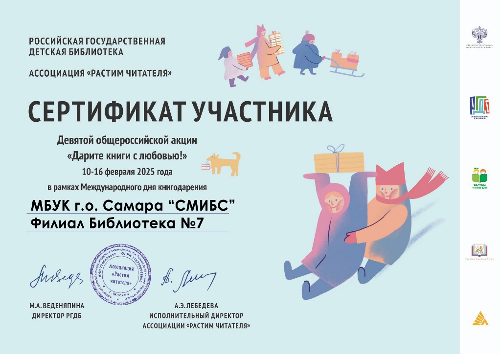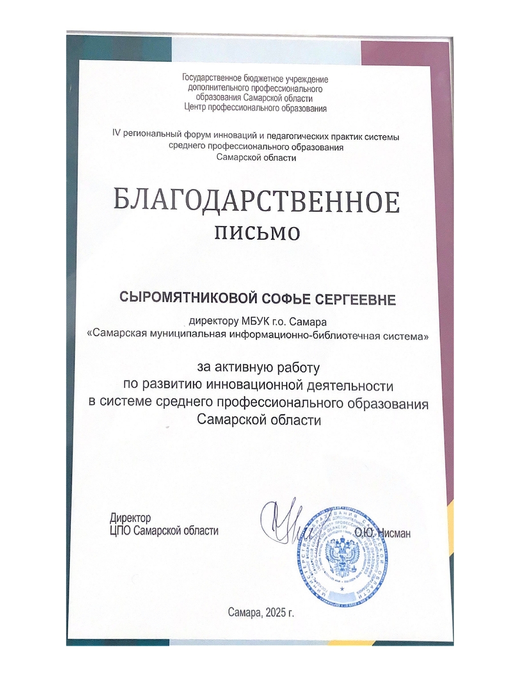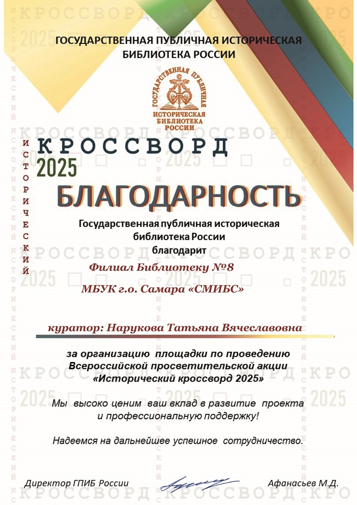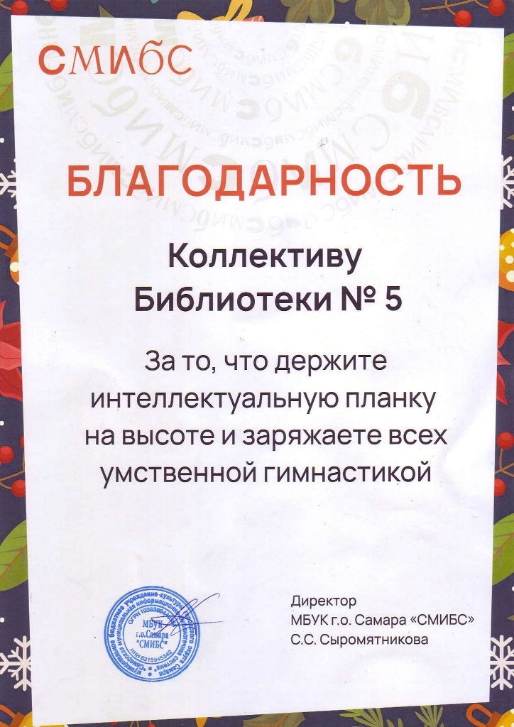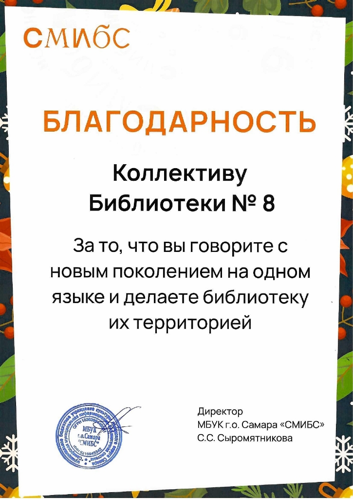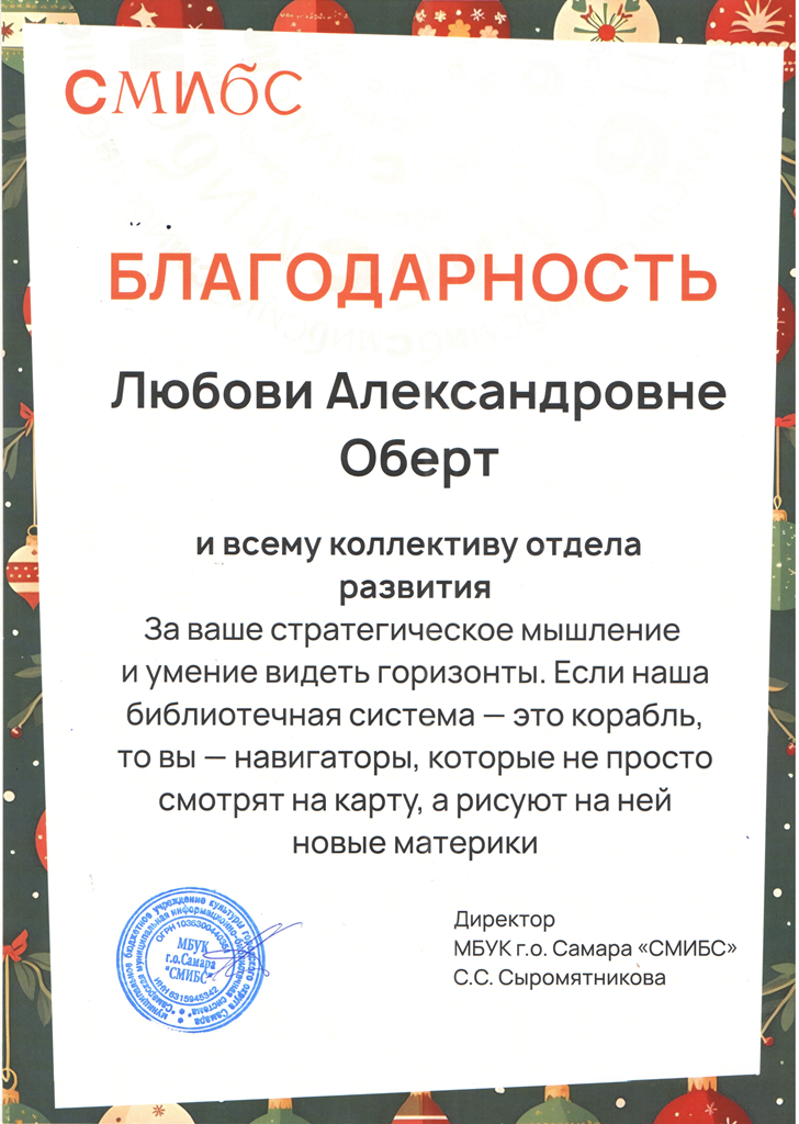 СМИБС Сыромятниковой С.С., директору СМИБС Чиндина М.С., ЦГБ ЦГБ Тишина Е.А., ЦГБ Коноплева Т.А., ЦГБ Перепелкина Е.В., ЦГБ Ф.12 Диплом (Лермонтов) ф.12 Диплом VIII Всероссийская акция 200 минут чтения Сталинграду посвящается Данилова, ф.7 Диплом Бомбина Е.В. Библиотека №29 Почетная грамота Оберт Л.А., отдел развития Почетная грамота Данилова О.В., ф.7 грамота Белова Л.Н. ф.11 Грамота Тихонова И.Ю. ф.11 Грамота благодарность Роману Сукманову благодарность библиотеке 16 благодарность Гузановой Е.А., ф.16 благодарность Кузнецовой С.В., ф.16 ф.31 коллективу филиала от Администрации района Ф.28 Стрижакова Благодарность Администрации Красноглинского района Т.И. Ф.28 Стрижакова Т.И. Благодарность ТОС Управленческий Библиотека №29 Благодарность ф.8 благодарность Благодарность коллективу Библиотеки № 5 ф.8 благодарность от директора СМИБС Отдел развития Немчанова ф.2 Воробьёва ф.1 Левина ф.2 Ф.22 Морозова, отдел развития Суворов А.С., отдел развития Ф.28 Благодарственное письмо Департамент 80 лет Библиотеке 28 Костина О.С. ф19 Благодарственное письмо ф.6 Благодарственное письмо ф.5 Евтюхина С.И., Библиотека №29 Благодарственное письмо Бомбина Е.В. Библиотека №29 Благодарственное письмо Черных Л.Н. Библиотека №29 Благодарственное письмо Князевой Г.Ю. Библиотека №29 Благодарственное письмо Библиотека №29 Благодарственное письмо Горбунова Е. В., ф.5 Благодарственное письмо Конференция Ваулина Л.Б., ф.8 Ф.12 Валеева А.Г. Благодарственное письмо Черных Л.Н. Библиотека №29 Благодарственное письмо Данилова О.В., ф.7 Благодарственное письмо ф.11-БП ф.30 Кириленко. Благодарственное письмо (район) Тихонова И.Ю. ф.11 БП ф.11 БП Бомбина Е.В. Библиотека №29 Благодарственное письмо Черных Л.Н. Библиотека №29 Благодарственное письмо Костина О.С., ф19 Благодарственное письмо Оберт Л.А., отдел развития ф.11-1 Горбунова Е.В., ф.5 Горбунова Е.В., ф.5 Библиотека № 5 Носач О.В., ф.5 Руденко О.Н., ф.5 Библиотека № 5 Горбунова Е.В., ф.5 Арсланова О.В., ф.5 Преодоление Носач О.В., ф.5 Горбунова Е.В., ф.5 Евсеева Л.В., ф.9 ф.11-2 Ф.12 Матерова (Шукшин) Ф12 Сертификат волонтеры 2025 Тимофеева Ю.К. Морозова Ю.Д. Оберт Л.А. Оберт Л.А., отдел развития Оберт Л.А., отдел развития Оберт Л.А. ф.7 Данилова, финансовая грамотность, сертификат Мерзлякова Н.С., ф.8 будущее библиотек Ф.28 СтрижаковаТ.И. Диплом Засекинские чтения Носач О.В., ф.5 Ф.12 Сертификат участника Ф.7 Сертификат Тишина Е.А., ЦГБ Краснянская И.Ю., ф.5 Сертификат участника Память в наследство Носач О.В., ф.5 сертификат Головченко У. Сертификат Комиссаровой Т. Сертификат Тихоновой И.Ю. Сертификат Чистяковой А. Перепелкина Е.В., ЦГБ Оберт Л.А., ОР Носач О.В., ф.5 Сертификат Носач О.В., ф.5 Носач О.В. Оберт Л.А. Носач О.В, ф.5