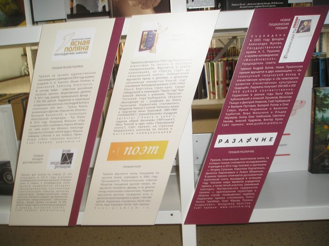 Дополняет центральную часть экспозиции раздел о лауреатах менее известных премий, но пользующихся у литературного сообщества значительным авторитетом. Среди них: «Ясная Поляна», «Премия Андрея Белого», «Рукопись года», «Дебют» и другие. Всего дюжина отечественных премий, у каждой из которых – свои звёзды современной литературы. Ежегодно называются победители премий, книгами которых пополняется выставка.