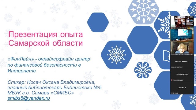 Сотрудник Библиотеки №5 СМИБС, главный библиотекарь Оксана Владимировна Носач рассказала о результатах проекта "ФинЛайн", его особенности и актуальности в современном обществе, партнерах проекта, фактической пользе для целевой аудитории - граждан серебряного возраста, подчеркнула роль библиотек в развитии финансовой грамотности и информационной культуры в целом. И, конечно, выразила благодарность АРФГ за поддержку проекта!