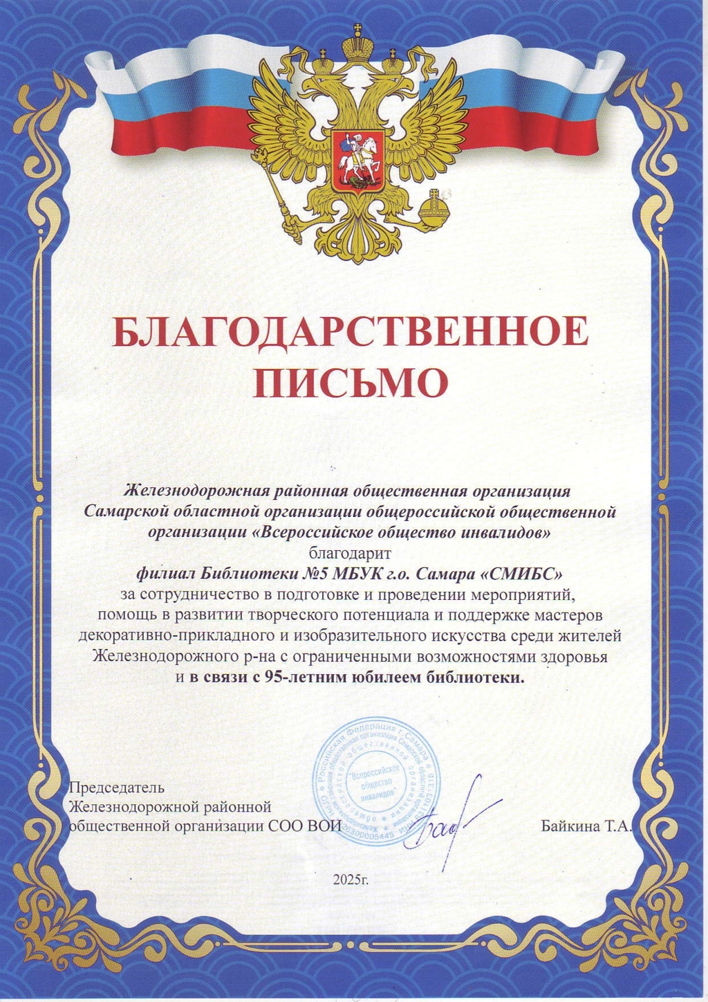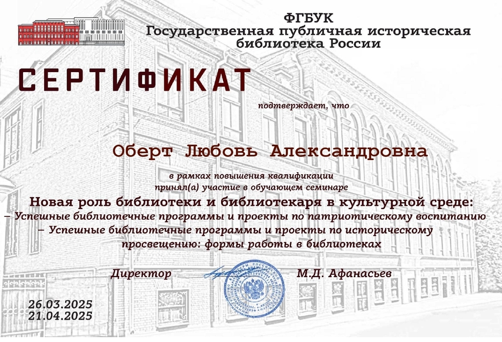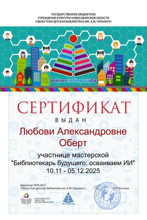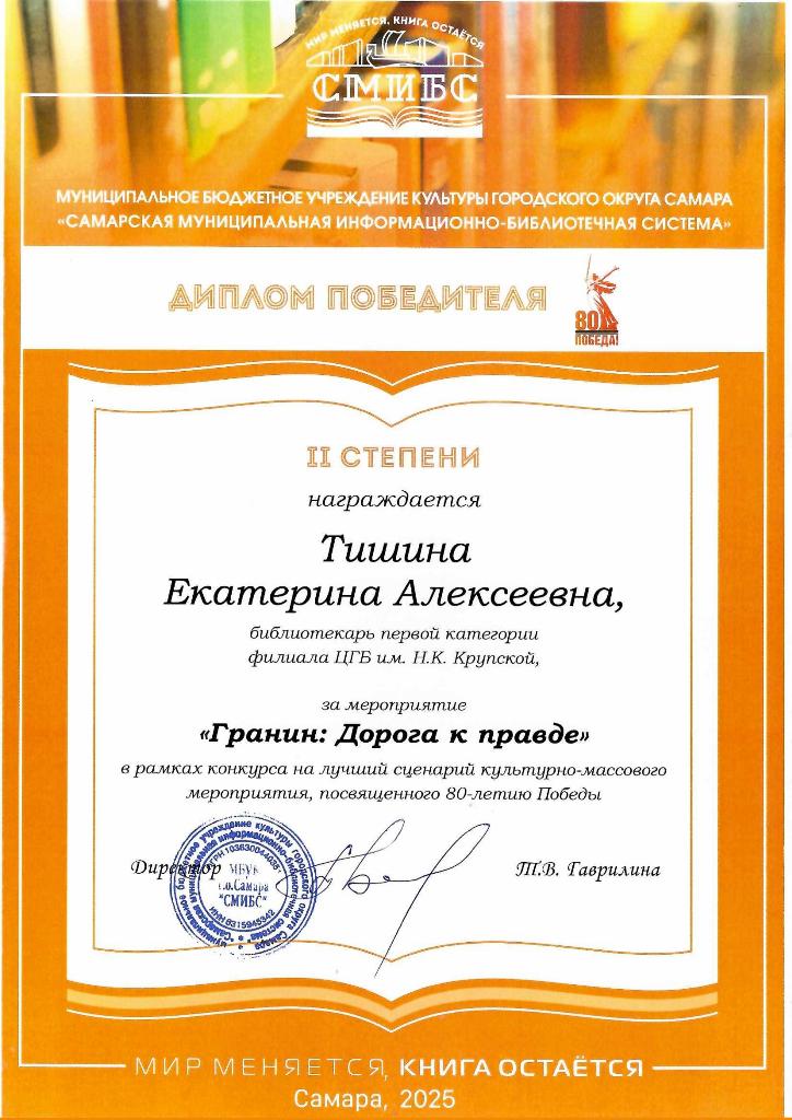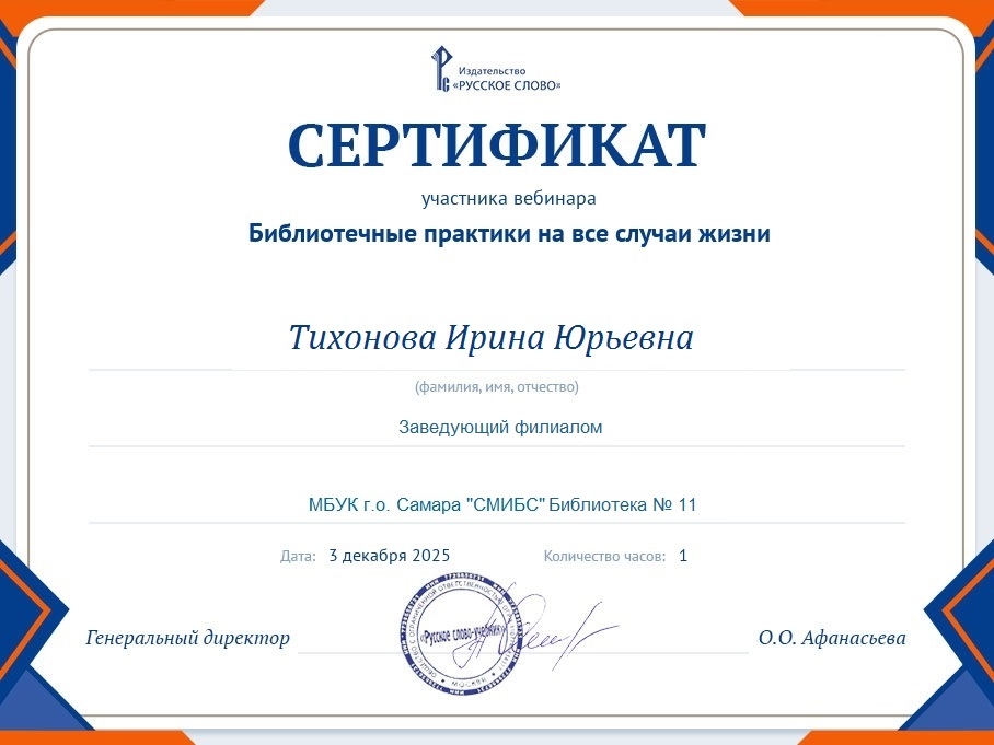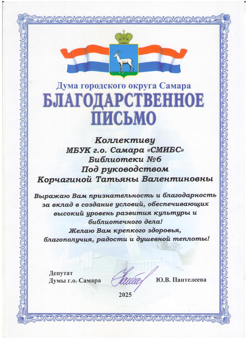 СМИБС Сыромятниковой С.С., директору СМИБС Чиндина М.С., ЦГБ ЦГБ Тишина Е.А., ЦГБ Коноплева Т.А., ЦГБ Перепелкина Е.В., ЦГБ Ф.12 Диплом (Лермонтов) ф.12 Диплом VIII Всероссийская акция 200 минут чтения Сталинграду посвящается Данилова, ф.7 Диплом Бомбина Е.В. Библиотека №29 Почетная грамота Оберт Л.А., отдел развития Почетная грамота Данилова О.В., ф.7 грамота Белова Л.Н. ф.11 Грамота Тихонова И.Ю. ф.11 Грамота благодарность Роману Сукманову благодарность библиотеке 16 благодарность Гузановой Е.А., ф.16 благодарность Кузнецовой С.В., ф.16 ф.31 коллективу филиала от Администрации района Ф.28 Стрижакова Благодарность Администрации Красноглинского района Т.И. Ф.28 Стрижакова Т.И. Благодарность ТОС Управленческий Библиотека №29 Благодарность ф.8 благодарность Благодарность коллективу Библиотеки № 5 ф.8 благодарность от директора СМИБС Отдел развития Немчанова ф.2 Воробьёва ф.1 Левина ф.2 Ф.22 Морозова, отдел развития Суворов А.С., отдел развития Ф.28 Благодарственное письмо Департамент 80 лет Библиотеке 28 Костина О.С. ф19 Благодарственное письмо ф.6 Благодарственное письмо ф.5 Евтюхина С.И., Библиотека №29 Благодарственное письмо Бомбина Е.В. Библиотека №29 Благодарственное письмо Черных Л.Н. Библиотека №29 Благодарственное письмо Князевой Г.Ю. Библиотека №29 Благодарственное письмо Библиотека №29 Благодарственное письмо Горбунова Е. В., ф.5 Благодарственное письмо Конференция Ваулина Л.Б., ф.8 Ф.12 Валеева А.Г. Благодарственное письмо Черных Л.Н. Библиотека №29 Благодарственное письмо Данилова О.В., ф.7 Благодарственное письмо ф.11-БП ф.30 Кириленко. Благодарственное письмо (район) Тихонова И.Ю. ф.11 БП ф.11 БП Бомбина Е.В. Библиотека №29 Благодарственное письмо Черных Л.Н. Библиотека №29 Благодарственное письмо Костина О.С., ф19 Благодарственное письмо Оберт Л.А., отдел развития ф.11-1 Горбунова Е.В., ф.5 Горбунова Е.В., ф.5 Библиотека № 5 Носач О.В., ф.5 Руденко О.Н., ф.5 Библиотека № 5 Горбунова Е.В., ф.5 Арсланова О.В., ф.5 Преодоление Носач О.В., ф.5 Горбунова Е.В., ф.5 ф.11-2 Ф.12 Матерова (Шукшин) Ф12 Сертификат волонтеры 2025 Тимофеева Ю.К. Морозова Ю.Д. Оберт Л.А. Оберт Л.А., отдел развития Оберт Л.А., отдел развития Оберт Л.А. ф.7 Данилова, финансовая грамотность, сертификат Мерзлякова Н.С., ф.8 будущее библиотек Ф.28 СтрижаковаТ.И. Диплом Засекинские чтения Носач О.В., ф.5 Ф.12 Сертификат участника Ф.7 Сертификат Тишина Е.А., ЦГБ Краснянская И.Ю., ф.5 Сертификат участника Память в наследство Носач О.В., ф.5 сертификат Головченко У. Сертификат Комиссаровой Т. Сертификат Тихоновой И.Ю. Сертификат Чистяковой А. Перепелкина Е.В., ЦГБ Оберт Л.А., ОР Носач О.В., ф.5 Сертификат Носач О.В., ф.5 Носач О.В. Оберт Л.А. Носач О.В, ф.5