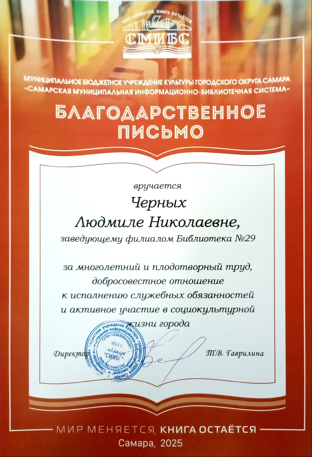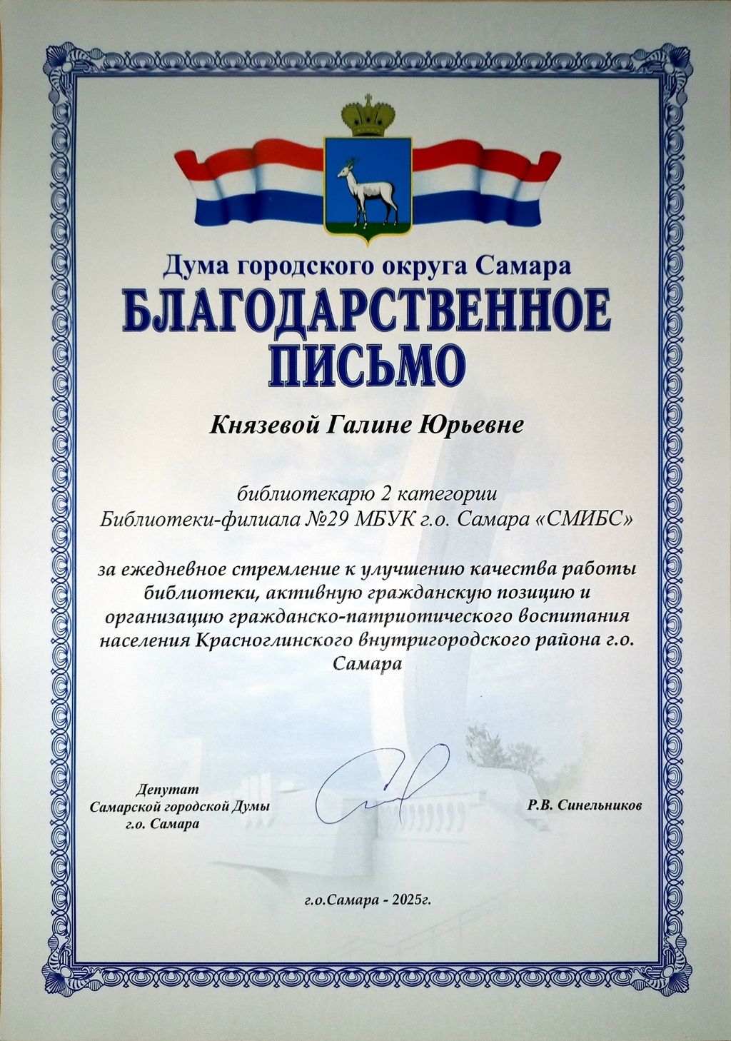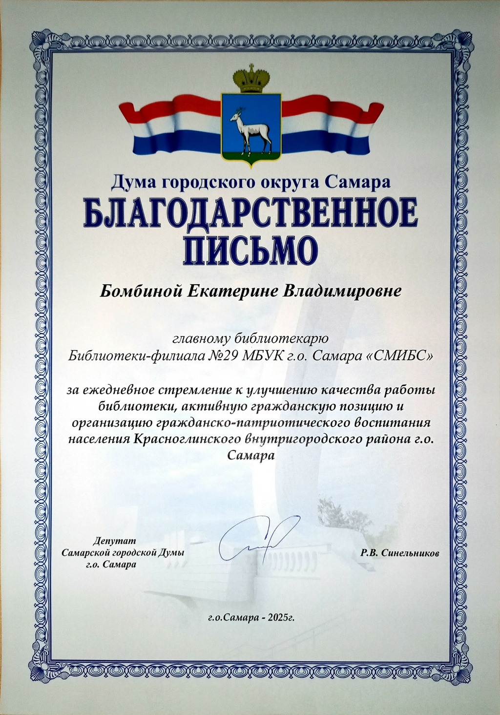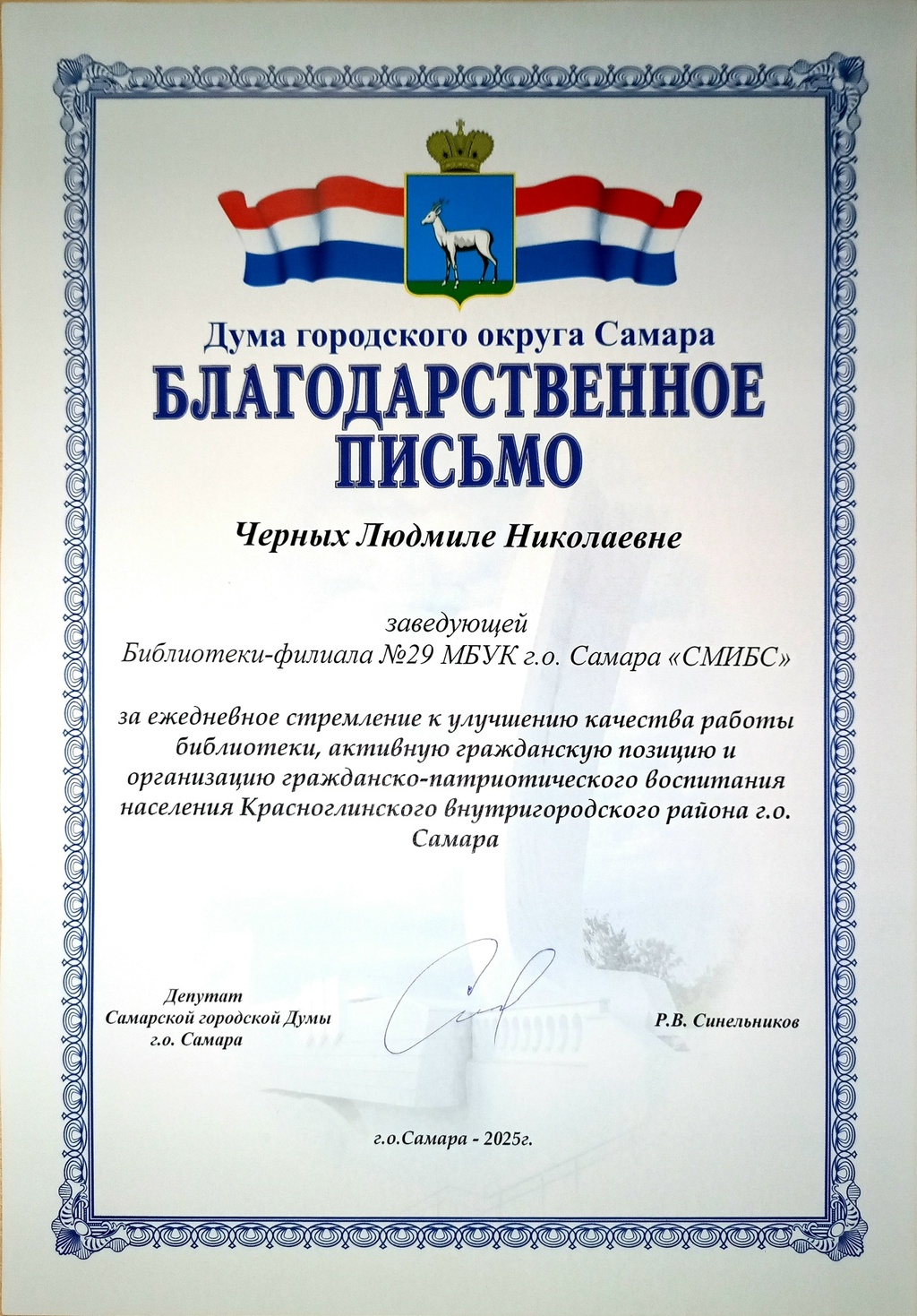 СМИБС Сыромятниковой С.С., директору СМИБС Чиндина М.С., ЦГБ ЦГБ Тишина Е.А., ЦГБ Коноплева Т.А., ЦГБ Перепелкина Е.В., ЦГБ Ф.12 Диплом (Лермонтов) ф.12 Диплом VIII Всероссийская акция 200 минут чтения Сталинграду посвящается Данилова, ф.7 Диплом Бомбина Е.В. Библиотека №29 Почетная грамота Оберт Л.А., отдел развития Почетная грамота Данилова О.В., ф.7 грамота Белова Л.Н. ф.11 Грамота Тихонова И.Ю. ф.11 Грамота благодарность Роману Сукманову благодарность библиотеке 16 благодарность Гузановой Е.А., ф.16 благодарность Кузнецовой С.В., ф.16 ф.31 коллективу филиала от Администрации района Ф.28 Стрижакова Благодарность Администрации Красноглинского района Т.И. Ф.28 Стрижакова Т.И. Благодарность ТОС Управленческий Библиотека №29 Благодарность ф.8 благодарность Благодарность коллективу Библиотеки № 5 ф.8 благодарность от директора СМИБС Отдел развития Немчанова ф.2 Воробьёва ф.1 Левина ф.2 Ф.22 Морозова, отдел развития Суворов А.С., отдел развития Ф.28 Благодарственное письмо Департамент 80 лет Библиотеке 28 Костина О.С. ф19 Благодарственное письмо ф.6 Благодарственное письмо ф.5 Евтюхина С.И., Библиотека №29 Благодарственное письмо Бомбина Е.В. Библиотека №29 Благодарственное письмо Черных Л.Н. Библиотека №29 Благодарственное письмо Князевой Г.Ю. Библиотека №29 Благодарственное письмо Библиотека №29 Благодарственное письмо Горбунова Е. В., ф.5 Благодарственное письмо Конференция Ваулина Л.Б., ф.8 Ф.12 Валеева А.Г. Благодарственное письмо Черных Л.Н. Библиотека №29 Благодарственное письмо Данилова О.В., ф.7 Благодарственное письмо ф.11-БП ф.30 Кириленко. Благодарственное письмо (район) Тихонова И.Ю. ф.11 БП ф.11 БП Бомбина Е.В. Библиотека №29 Благодарственное письмо Черных Л.Н. Библиотека №29 Благодарственное письмо Костина О.С., ф19 Благодарственное письмо Оберт Л.А., отдел развития ф.11-1 Горбунова Е.В., ф.5 Горбунова Е.В., ф.5 Библиотека № 5 Носач О.В., ф.5 Руденко О.Н., ф.5 Библиотека № 5 Горбунова Е.В., ф.5 Арсланова О.В., ф.5 Преодоление Носач О.В., ф.5 Горбунова Е.В., ф.5 ф.11-2 Ф.12 Матерова (Шукшин) Ф12 Сертификат волонтеры 2025 Тимофеева Ю.К. Морозова Ю.Д. Оберт Л.А. Оберт Л.А., отдел развития Оберт Л.А., отдел развития Оберт Л.А. ф.7 Данилова, финансовая грамотность, сертификат Мерзлякова Н.С., ф.8 будущее библиотек Ф.28 СтрижаковаТ.И. Диплом Засекинские чтения Носач О.В., ф.5 Ф.12 Сертификат участника Ф.7 Сертификат Тишина Е.А., ЦГБ Краснянская И.Ю., ф.5 Сертификат участника Память в наследство Носач О.В., ф.5 сертификат Головченко У. Сертификат Комиссаровой Т. Сертификат Тихоновой И.Ю. Сертификат Чистяковой А. Перепелкина Е.В., ЦГБ Оберт Л.А., ОР Носач О.В., ф.5 Сертификат Носач О.В., ф.5 Носач О.В. Оберт Л.А. Носач О.В, ф.5