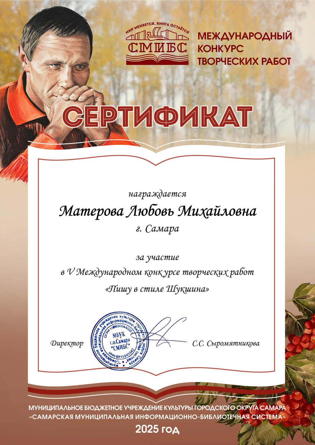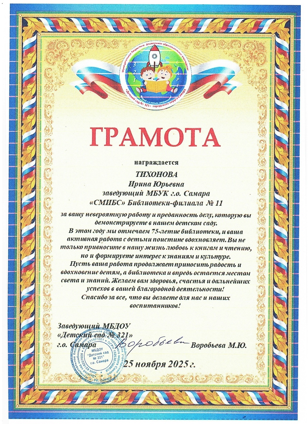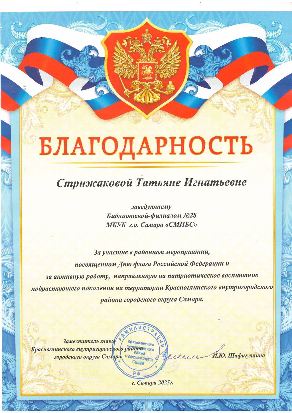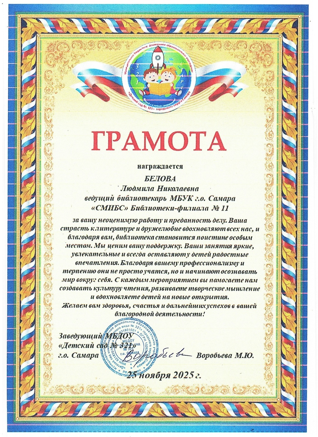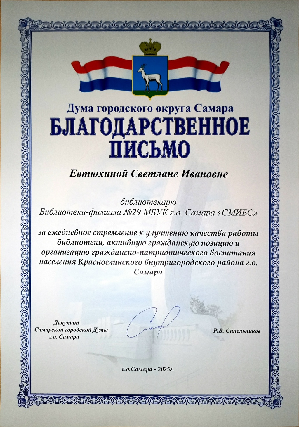 СМИБС Сыромятниковой С.С., директору СМИБС Чиндина М.С., ЦГБ ЦГБ Тишина Е.А., ЦГБ Коноплева Т.А., ЦГБ Перепелкина Е.В., ЦГБ Ф.12 Диплом (Лермонтов) ф.12 Диплом VIII Всероссийская акция 200 минут чтения Сталинграду посвящается Данилова, ф.7 Диплом Бомбина Е.В. Библиотека №29 Почетная грамота Оберт Л.А., отдел развития Почетная грамота Данилова О.В., ф.7 грамота Белова Л.Н. ф.11 Грамота Тихонова И.Ю. ф.11 Грамота благодарность Роману Сукманову благодарность библиотеке 16 благодарность Гузановой Е.А., ф.16 благодарность Кузнецовой С.В., ф.16 ф.31 коллективу филиала от Администрации района Ф.28 Стрижакова Благодарность Администрации Красноглинского района Т.И. Ф.28 Стрижакова Т.И. Благодарность ТОС Управленческий Библиотека №29 Благодарность ф.8 благодарность Благодарность коллективу Библиотеки № 5 ф.8 благодарность от директора СМИБС Отдел развития Немчанова ф.2 Воробьёва ф.1 Левина ф.2 Ф.22 Морозова, отдел развития Суворов А.С., отдел развития Ф.28 Благодарственное письмо Департамент 80 лет Библиотеке 28 Костина О.С. ф19 Благодарственное письмо ф.6 Благодарственное письмо ф.5 Евтюхина С.И., Библиотека №29 Благодарственное письмо Бомбина Е.В. Библиотека №29 Благодарственное письмо Черных Л.Н. Библиотека №29 Благодарственное письмо Князевой Г.Ю. Библиотека №29 Благодарственное письмо Библиотека №29 Благодарственное письмо Горбунова Е. В., ф.5 Благодарственное письмо Конференция Ваулина Л.Б., ф.8 Ф.12 Валеева А.Г. Благодарственное письмо Черных Л.Н. Библиотека №29 Благодарственное письмо Данилова О.В., ф.7 Благодарственное письмо ф.11-БП ф.30 Кириленко. Благодарственное письмо (район) Тихонова И.Ю. ф.11 БП ф.11 БП Бомбина Е.В. Библиотека №29 Благодарственное письмо Черных Л.Н. Библиотека №29 Благодарственное письмо Костина О.С., ф19 Благодарственное письмо Оберт Л.А., отдел развития ф.11-1 Горбунова Е.В., ф.5 Горбунова Е.В., ф.5 Библиотека № 5 Носач О.В., ф.5 Руденко О.Н., ф.5 Библиотека № 5 Горбунова Е.В., ф.5 Арсланова О.В., ф.5 Преодоление Носач О.В., ф.5 Горбунова Е.В., ф.5 ф.11-2 Ф.12 Матерова (Шукшин) Ф12 Сертификат волонтеры 2025 Тимофеева Ю.К. Морозова Ю.Д. Оберт Л.А. Оберт Л.А., отдел развития Оберт Л.А., отдел развития Оберт Л.А. ф.7 Данилова, финансовая грамотность, сертификат Мерзлякова Н.С., ф.8 будущее библиотек Ф.28 СтрижаковаТ.И. Диплом Засекинские чтения Носач О.В., ф.5 Ф.12 Сертификат участника Ф.7 Сертификат Тишина Е.А., ЦГБ Краснянская И.Ю., ф.5 Сертификат участника Память в наследство Носач О.В., ф.5 сертификат Головченко У. Сертификат Комиссаровой Т. Сертификат Тихоновой И.Ю. Сертификат Чистяковой А. Перепелкина Е.В., ЦГБ Оберт Л.А., ОР Носач О.В., ф.5 Сертификат Носач О.В., ф.5 Носач О.В. Оберт Л.А. Носач О.В, ф.5